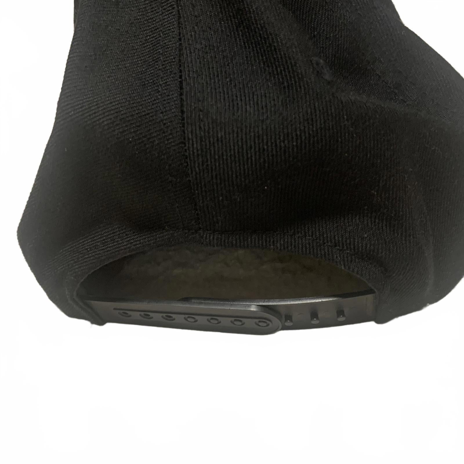 Black snapback cap featuring vibrant orange embroidery with the text 'Quiero Romi' and a bottle and cup design.